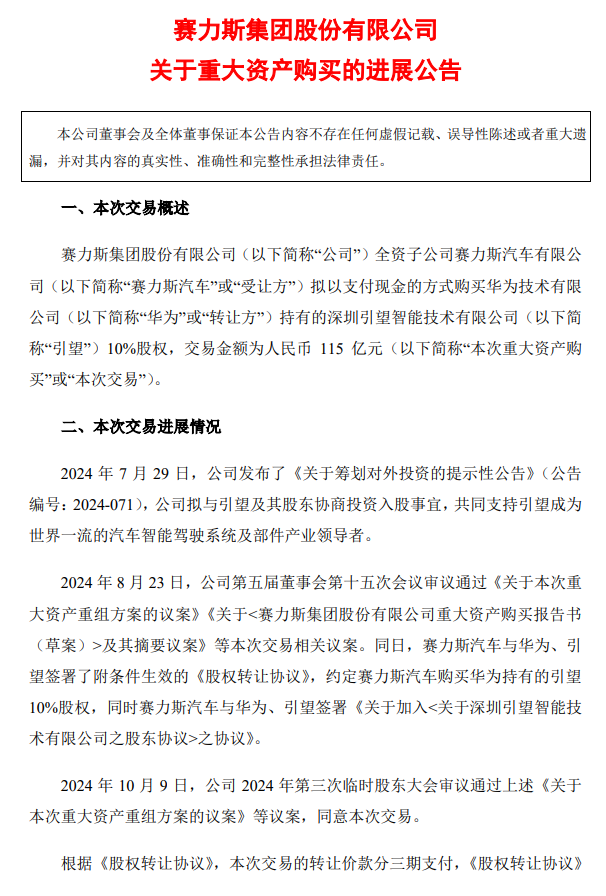 参考IT之家此前报道,赛力斯去年8月25日宣布赛力斯汽车拟以支付现金的方式购买华为技术有限公司持有的深圳引望智能技术有限公司10.00%股权,交易价格为115亿元。