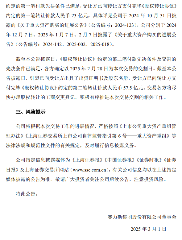 目前,引望已向赛力斯汽车出具了出资证明书及股东名册,赛力斯汽车已向华为支付完毕《股权转让协议》约定的第二笔转让价款人民币57.5亿元。交易各方将尽快办理股权转让的工商变更登记,积极有序推进本次交易交割的相关工作。